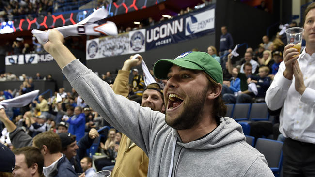 8000 Really Excited Guys in Whaler Hats: a fairly accurate sample of the crowd at UConn’s Hockey East home opener.